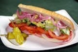 Greens, mozzarella, ham, pepperoni, salami, garbanzo beans, pepperoncini & green peppers, marinated onions, tomatoes, olives, mushrooms & house dressing.