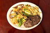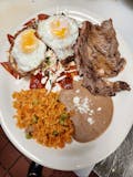 Corn tortillas fried w/ red salsa and ribeye steak, two eggs, fresh cheese, sour cream, avocado, rice & beans.